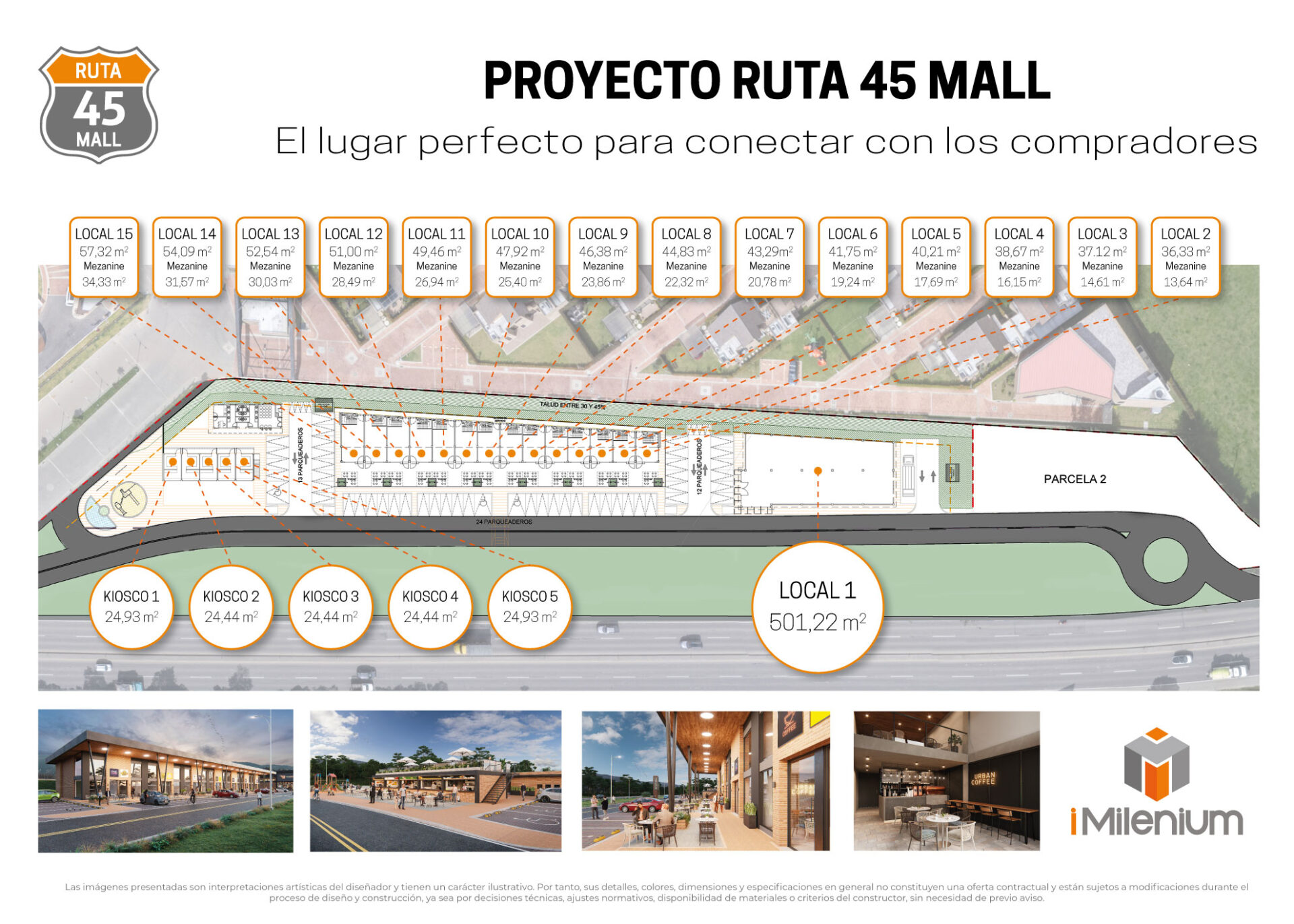 Los locales de Ruta 45 Mall se implantan de forma inteligente, alineados con la circulación natural del flujo peatonal y vehicular para maximizar la visibilidad y el confort. Cada espacio modular, diseñado en tonos neutros y materiales de alta calidad, crea una atmósfera de elegancia contemporánea, mientras el mezanine optimiza la espacialidad. Este planteamiento favorece tanto la experiencia del visitante como la rentabilidad de cada comercio.